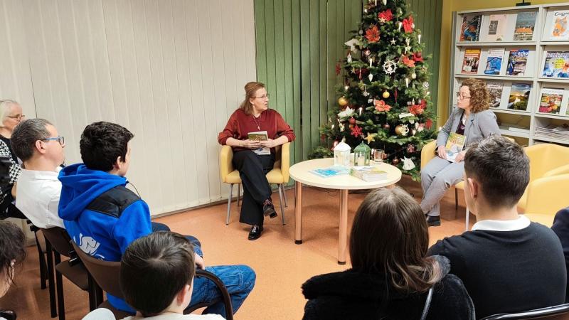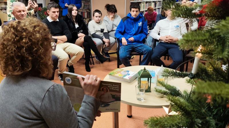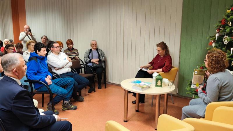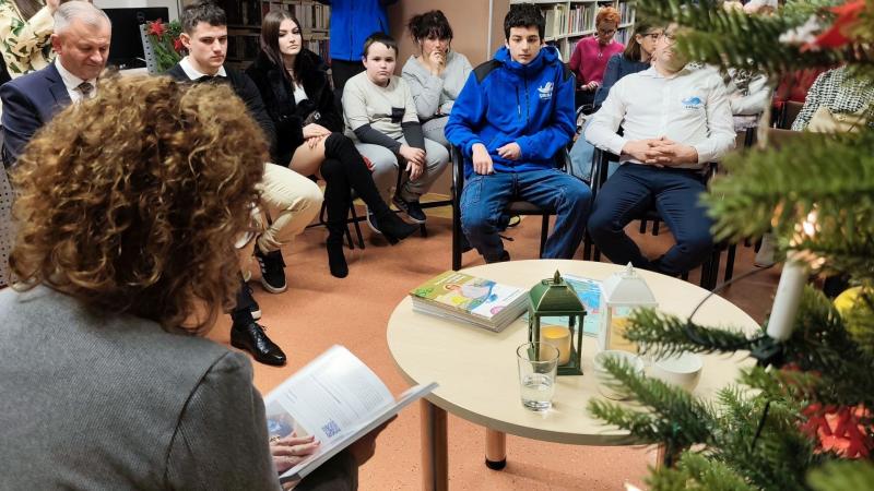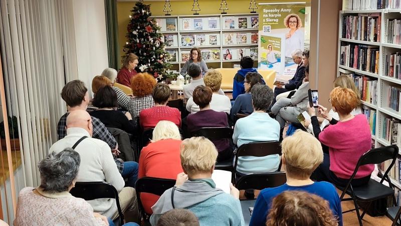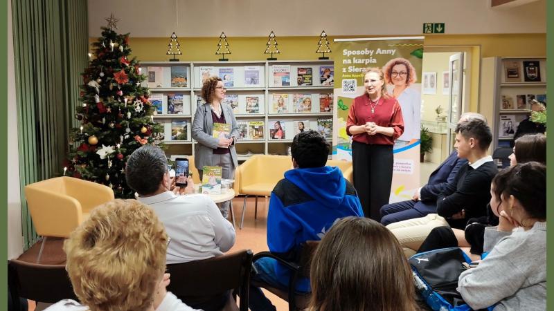 Spotkanie przebiegało w wyjątkowym, bożonarodzeniowym klimacie. Przestrzeń biblioteki została udekorowana świątecznymi ozdobami, a ciepłe światło lampek i zapach choinki sprzyjały rozmowom i refleksji. Autorka opowiedziała o genezie książki, inspiracjach czerpanych z lokalnych tradycji oraz o znaczeniu karpia z Sierag jako elementu regionalnego dziedzictwa kulinarnego, szczególnie w kontekście świąt Bożego Narodzenia.